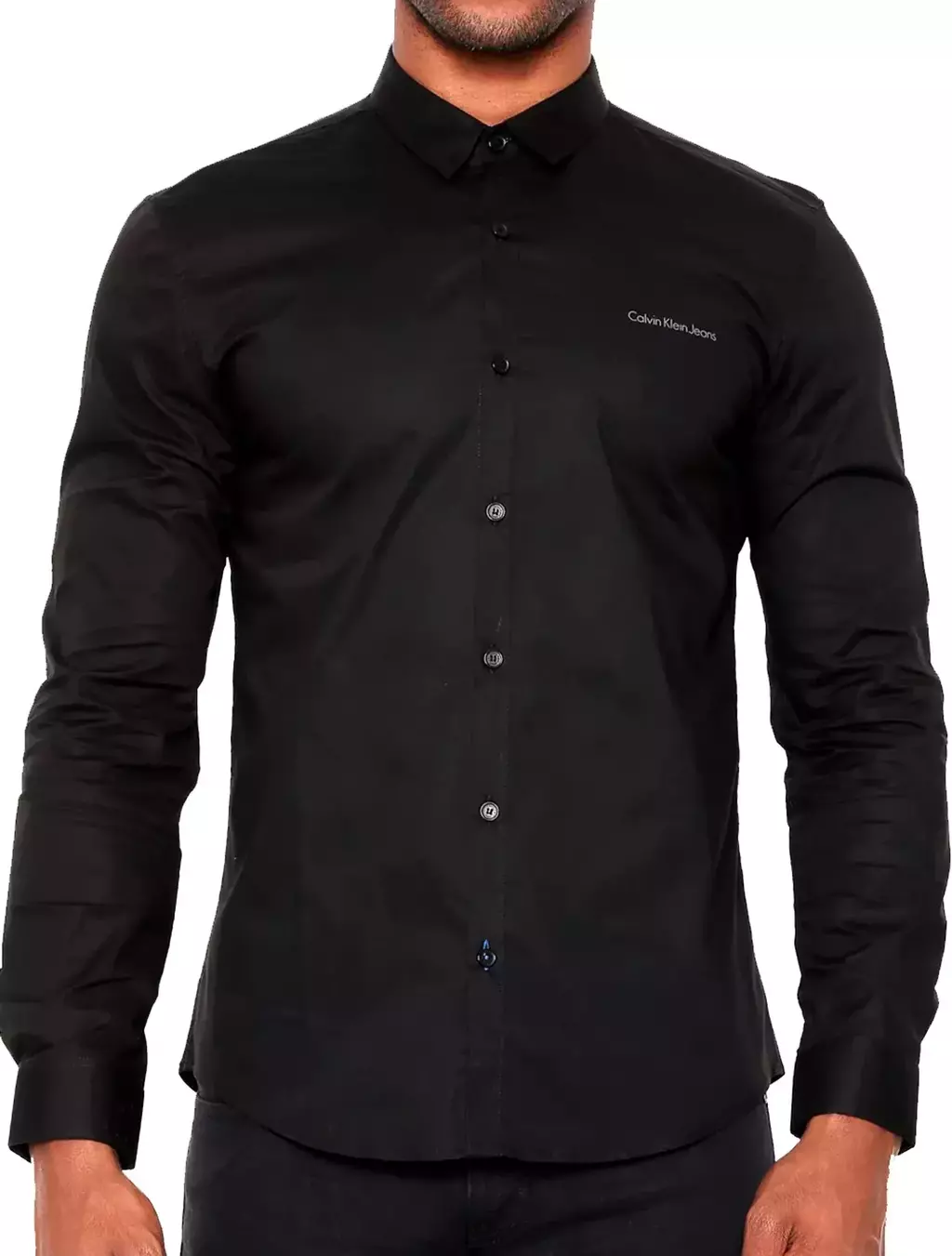 Camisa Calvin Klein Jeans Manga Longa Regular Lisa Basica Logo Peito Preta - CKJM901-0987