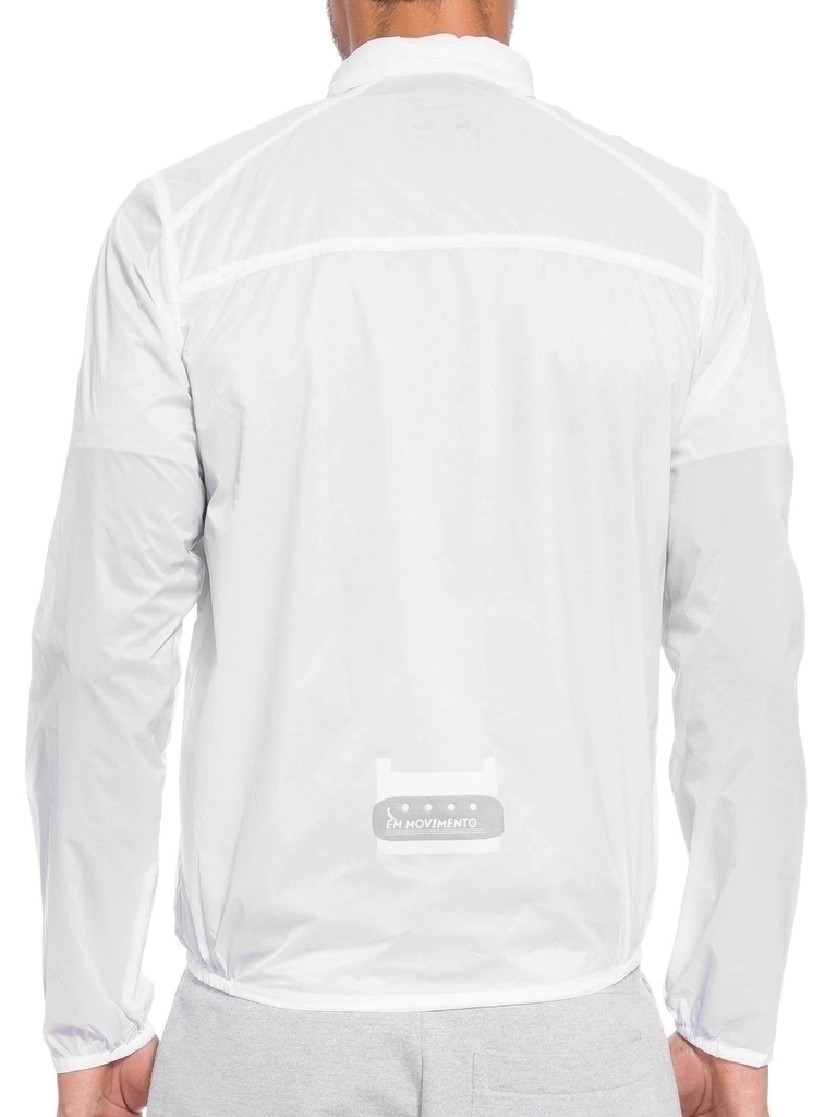 A jaqueta branca é confeccionada em tecido leve impermeável. A peça de modelagem reta possui gola alta, recorte nos ombros para fone de ouvido, mangas longas com elástico nos punhos, bolsos frontais com fechamento em zíper, logo refletivo da marca na altura do tórax e fechamento frontal por botões.